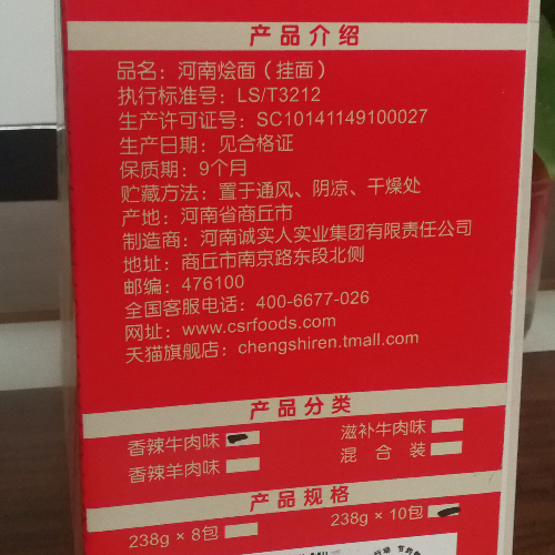 诚实人烩面礼盒238g*10,2380g每箱。